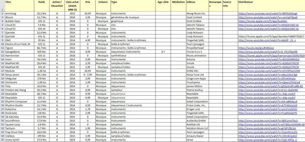 Ce tableau sera fort utile pour avoir une vue d’ensemble du fonds et permettra à vos collègues de trouver des réponses à leurs questions, l’application fonctionne-t-elle encore suite à la mise à jour de l’iOS, quel est son poids, le prix a-t’il évolué dans le temps, quand a eu lieu l’achat ?