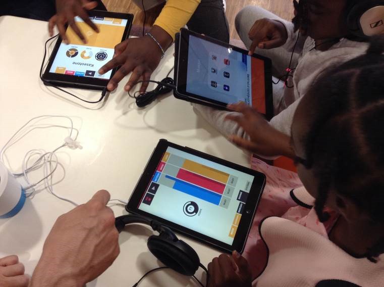 Au moment de la prise en main de la tablette, nous demandons à chaque participant s’il a déjà touché à un instrument de musique, et lequel il désire tester. L’enfant est libre de son temps, le médiateur tourne dans le groupe et distille des conseils, ou propose l’essai d’une autre application.