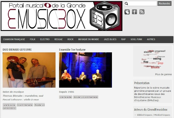 Un groupe de bibliothécaires musicaux de la région bordelaise a ainsi développé un site en ligne dédié à la promotion des musiciens locaux : le GirondEmusicbox. Les participants au projet ont été assez nombreux, issus des bibliothèques de Bordeaux, Pessac, Gradignan, Mérignac, Cestas, Talence et de la BDP 33. Un groupe de travail plus réduit s’est néanmoins structuré autour des personnes présentes en continue depuis le lancement du projet, avec Sylvette Peignon (Gradignan), Nicolas Clément (Bordeaux), Benoît Roucou (BDP), Jean-Marc Durand et Stéphane Udias (Pessac), Laura Devert (Cestas).