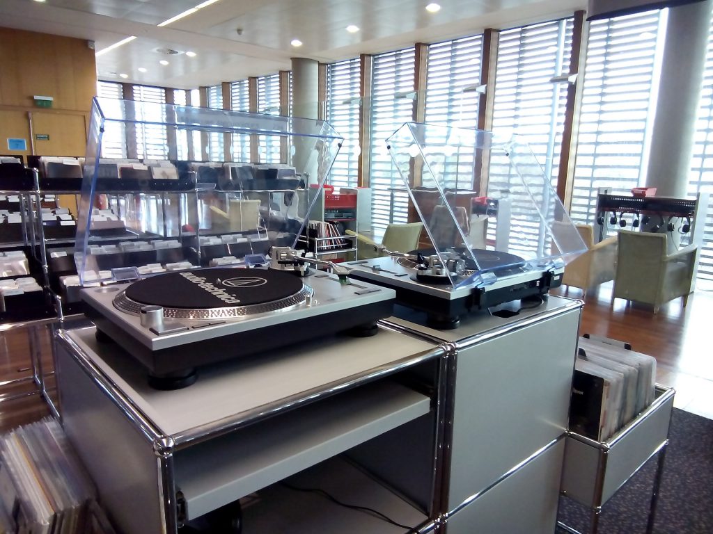 Des platines vinyles sont également empruntables offrant ainsi aux curieux non équipés la possibilité de découvrir ce fonds en constitution (plus de 750 vinyles)