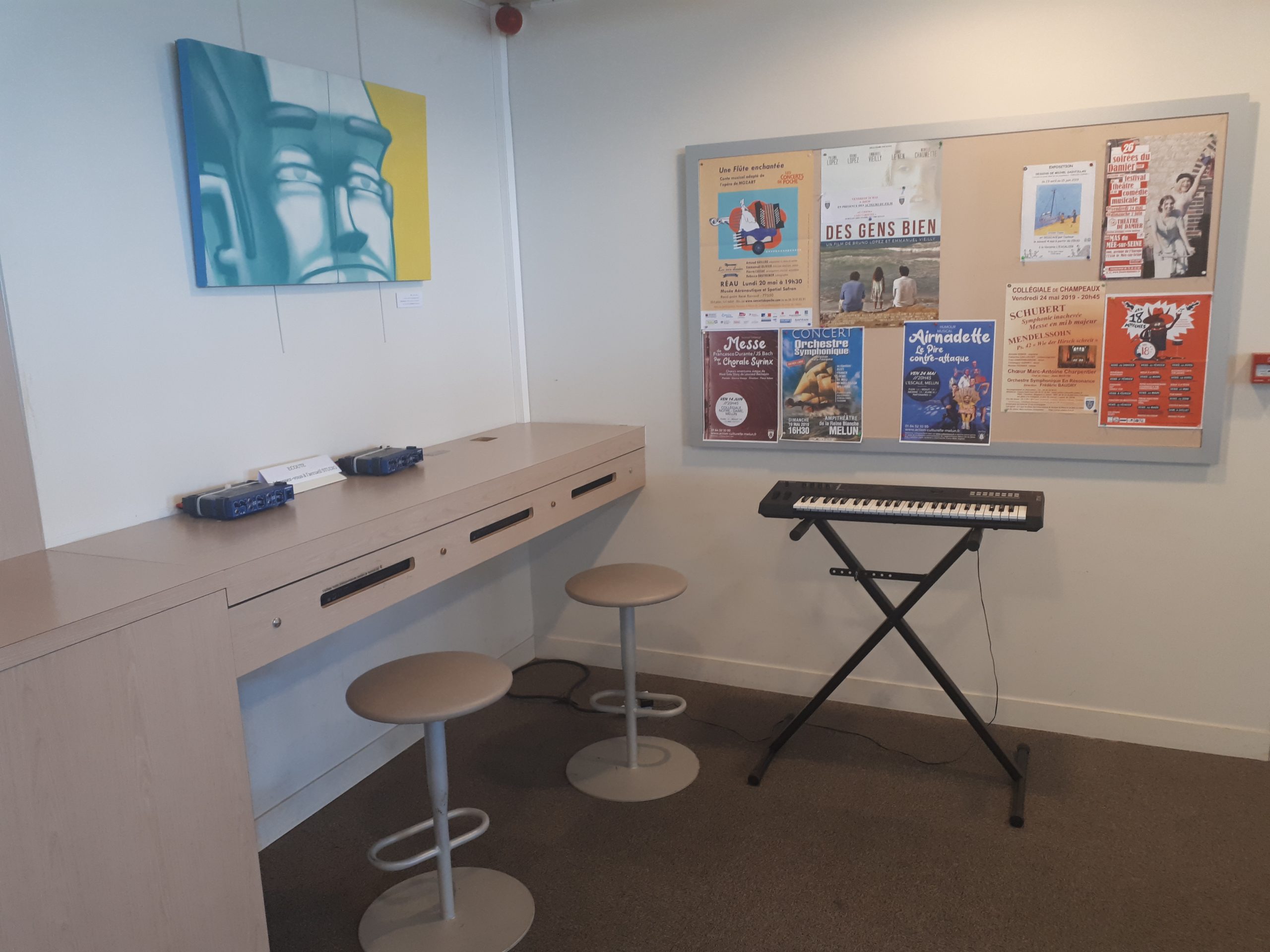 Platines d’écoute + Synthétiseur dans l’espace « Studio » de la médiathèque Astrolabe.
