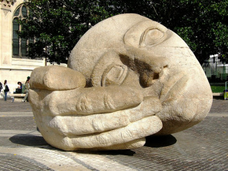 Écoute (Henri de Miller, 1986). Sculpture disposée dans le jardin des Halles, à quelques mètres de la Médiathèque musicale de Paris.