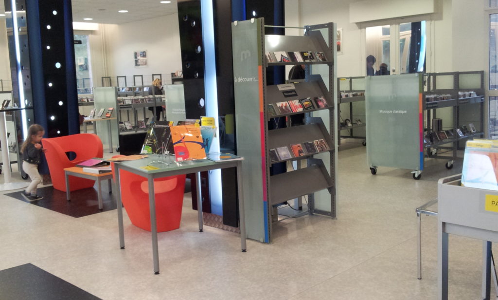 L’espace Musique, situé au rez-de-chaussée, offre près de 7000 CD pour adultes et enfants, des partitions et des livres CD pour les enfants.