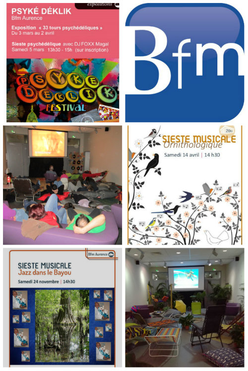 L’annexe d’Aurence fait partie du réseau de la Bibliothèque Francophone Multimédia de Limoges (Bfm). Depuis sa reconstruction et la réouverture en mai 2015 (l’ancien bâtiment datant des années 70 a été détruit…), nous proposons à la Bfm Aurence diverses animations en lien avec les services Discothèque, Vidéothèque et Jeux vidéo que nous gérons. Nous avons une belle salle d’animation qui nous permet de proposer des « mini-concerts » (dans le cadre de l’e-music box ), des projections de films, des expositions, des découvertes de jeux vidéos…et des siestes musicales. Pour ces moments d’écoute « à l’aise dans les transats » nous choisissons un thème et sélectionnons une quinzaine de titres que nous présentons brièvement à un public toujours très hétérogène. Nous faisons appel au service des espaces verts de la ville pour la décoration de la salle et aux centres culturels municipaux pour le matériel si besoin.