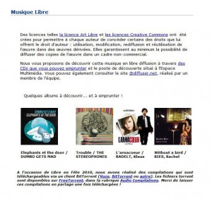 Plus simplement, certaines médiathèques (Médiathèque de Pacé et Médiathèque de la CDC du Pays d’Argentan par exemple) gravent sur CD-r une sélection d’albums de musique en libre diffusion ou une sélection de titres. Ces CD (gravés, avec jaquettes imprimées et conditions de licence précisées) suivent le circuit du document habituel (avec une indexation matière propre) et sont mis en prêt pour les usagers généralement dans un bac spécifique avec un fascicule mis à disposition pour expliquer ce qu’est la musique en libre diffusion et présenter les œuvres sélectionnées.